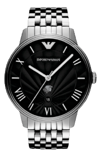 Reloj de pulso marca Emporio Armani, caja y extensible de acero inoxidable, mecanismo japonés con dos años de garantía, resistente a el agua 3 ATM con impresión de logotipo.